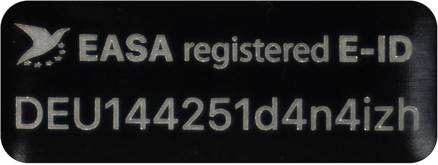 Flying-Drone Drohnen Plakette e-ID Kennzeichen Schild Alu | Design EASA registriert 20×8 e-ID / 20×11mm e-ID + Text | Lasergraviert feuerfest selbstklebend | für DJI Mini & alle Drohnen | <0,3g